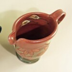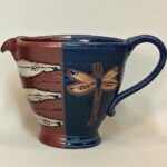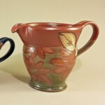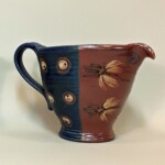 Not just for gravy anymore! Scramble eggs, mix baking or pancake ingredients, serve up your best hollandaise or au jus. One of the most used pots in the kitchen, pop it right in the dishwasher! Wheel thrown & slighly altered with pulled spout (that really works!) and handle. Handpainted motifs, food, microwave, dishwasher & oven safe. I keep trying to retire this pot & it just keeps coming back, cooks keep asking! 2.5-3 cups, sizes vary but generally 5″ tall, 7″ from spout to handle, 4 ” from front to back at the top.