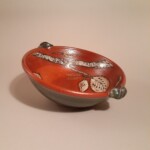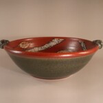 A customer requested a set of these and now, my absolute favorite! Not only a great noodle, soup or rice bowl, also perfect size for one meal’s side dish. 8.5″ diameter x 3″ or so deep, wheel thrown & trimmed stoneware with textured handles. Playfull handpainted motifs, blue or green glaze accent. Food, microwave, dishwasher & oven safe.